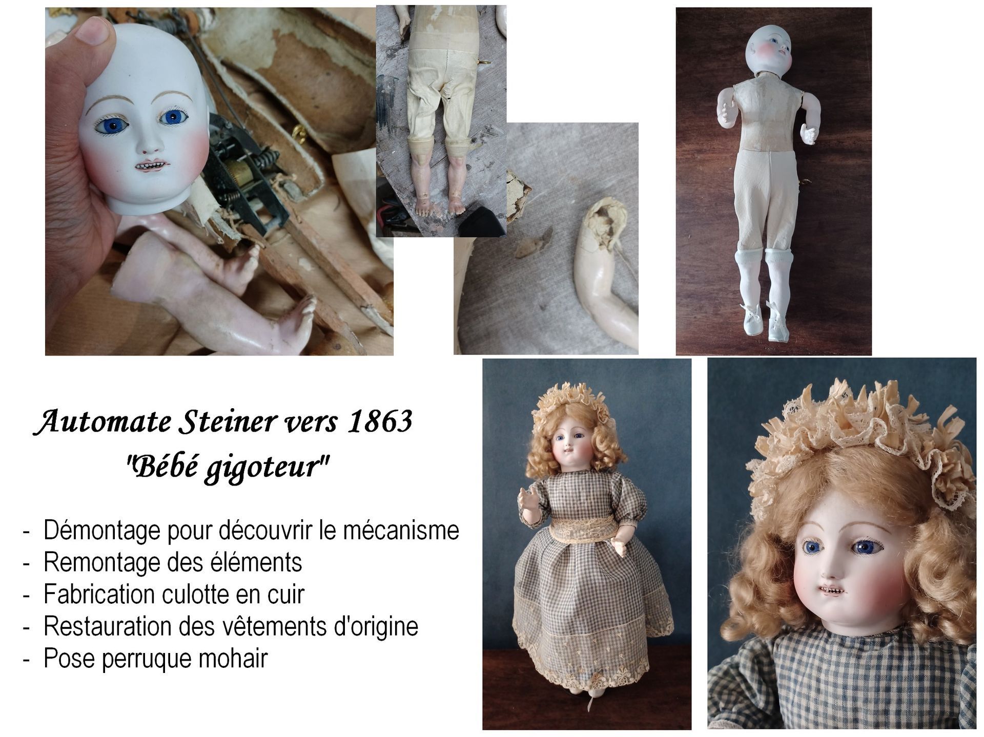 Afin que la restauration de cette poupée Gégé dure dans le temps, il a fallu traiter la matière. La bonne surprise est que le nettoyage a permis e conserver une grande partie du maquillage d'origine.