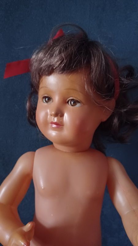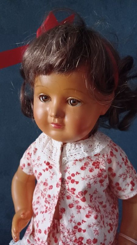 Rare et mignonne petite poupée avec un corps articulé à rotules, des yeux dormeurs en verre et une perruque en cheveux naturels.