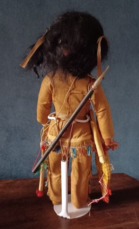 500€A rare and original Indian doll depicting a Canadian Blackfoot Indian with all his original clothing and equipment consisting of snowshoes, a lance, a case and probably two knives hanging from the waist.