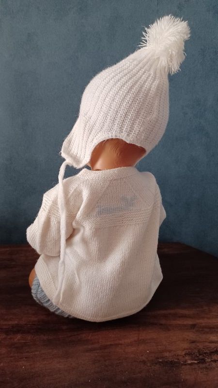 Ce baigneur est vendu habillé en laine avec culotte, gilets chaussons et bonnet.