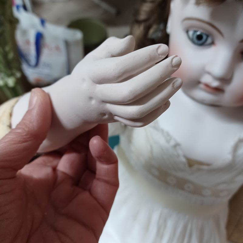 Poupée ancienne de la marque Bru, collage des morceaux, restauration de la tête en biscuit de porcelaine, remontage et entretien du corps, restauration de la perruque.