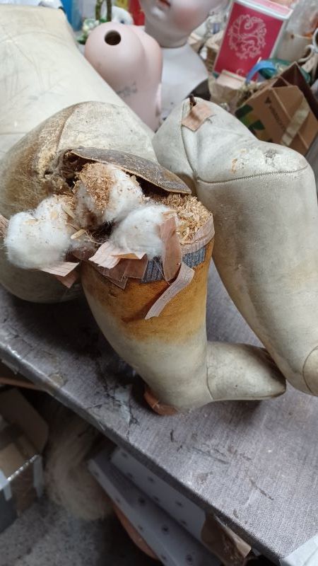 Etapes de la restauration d'une poupée ancienne de la marque Bru dont un morceau a été perdu.